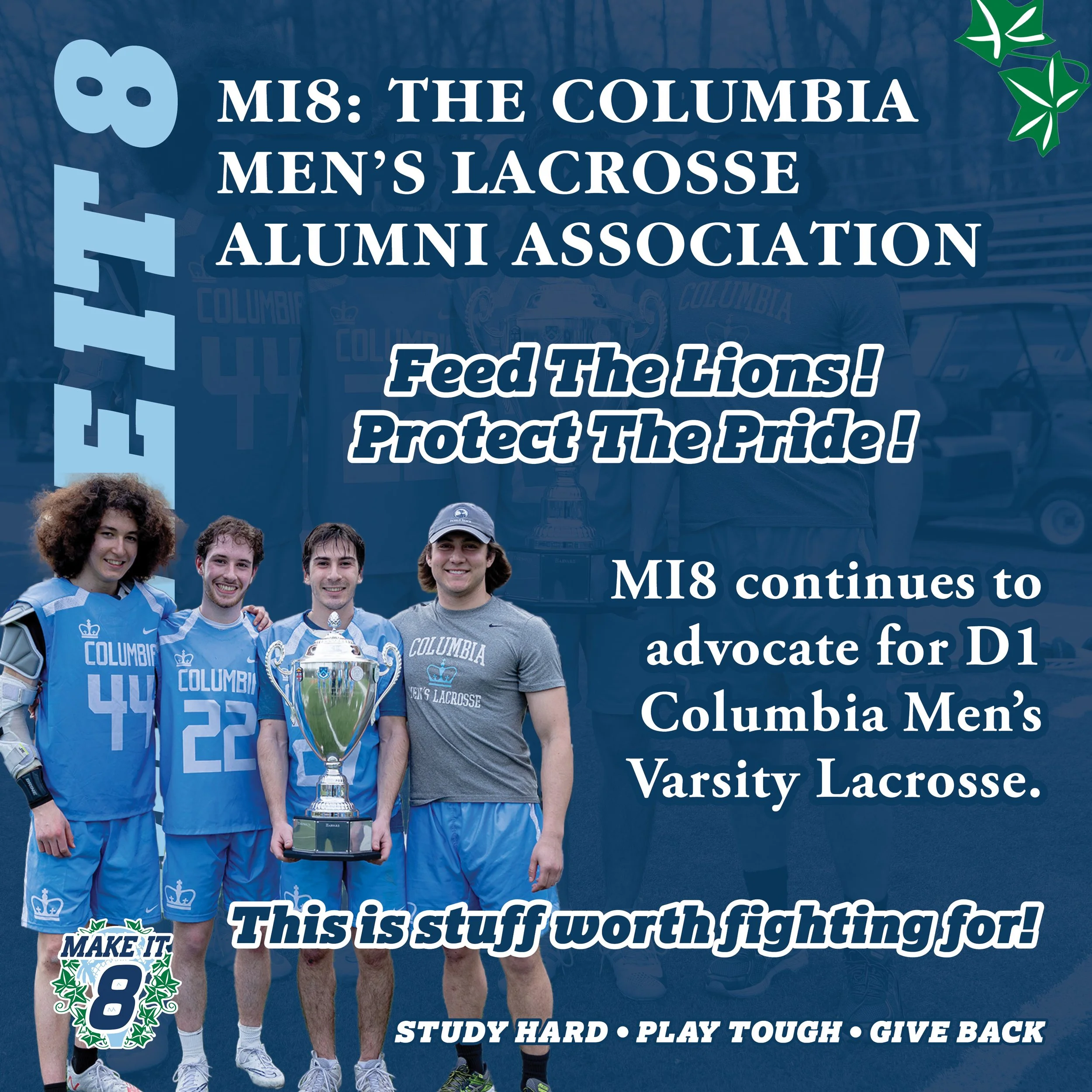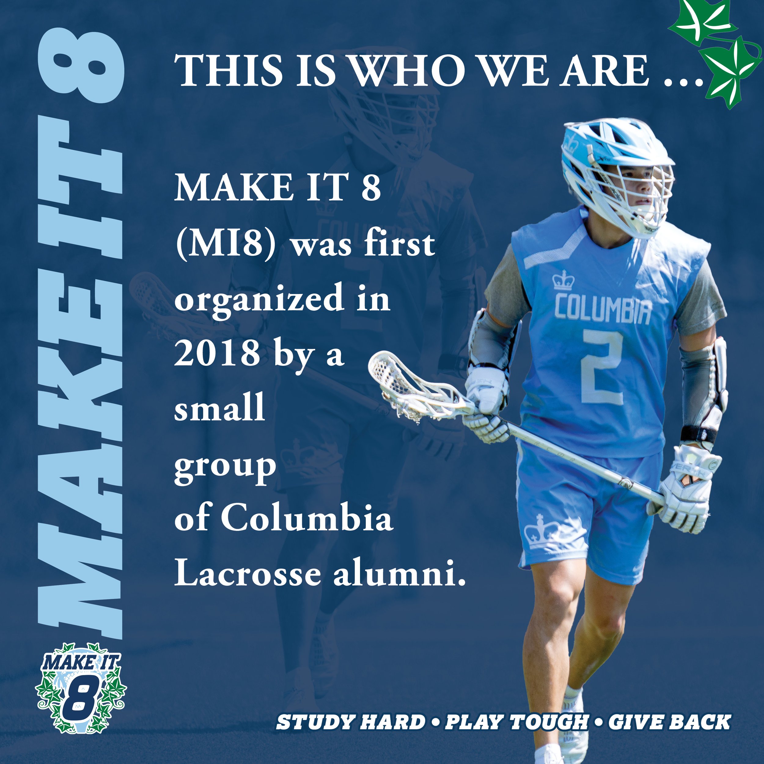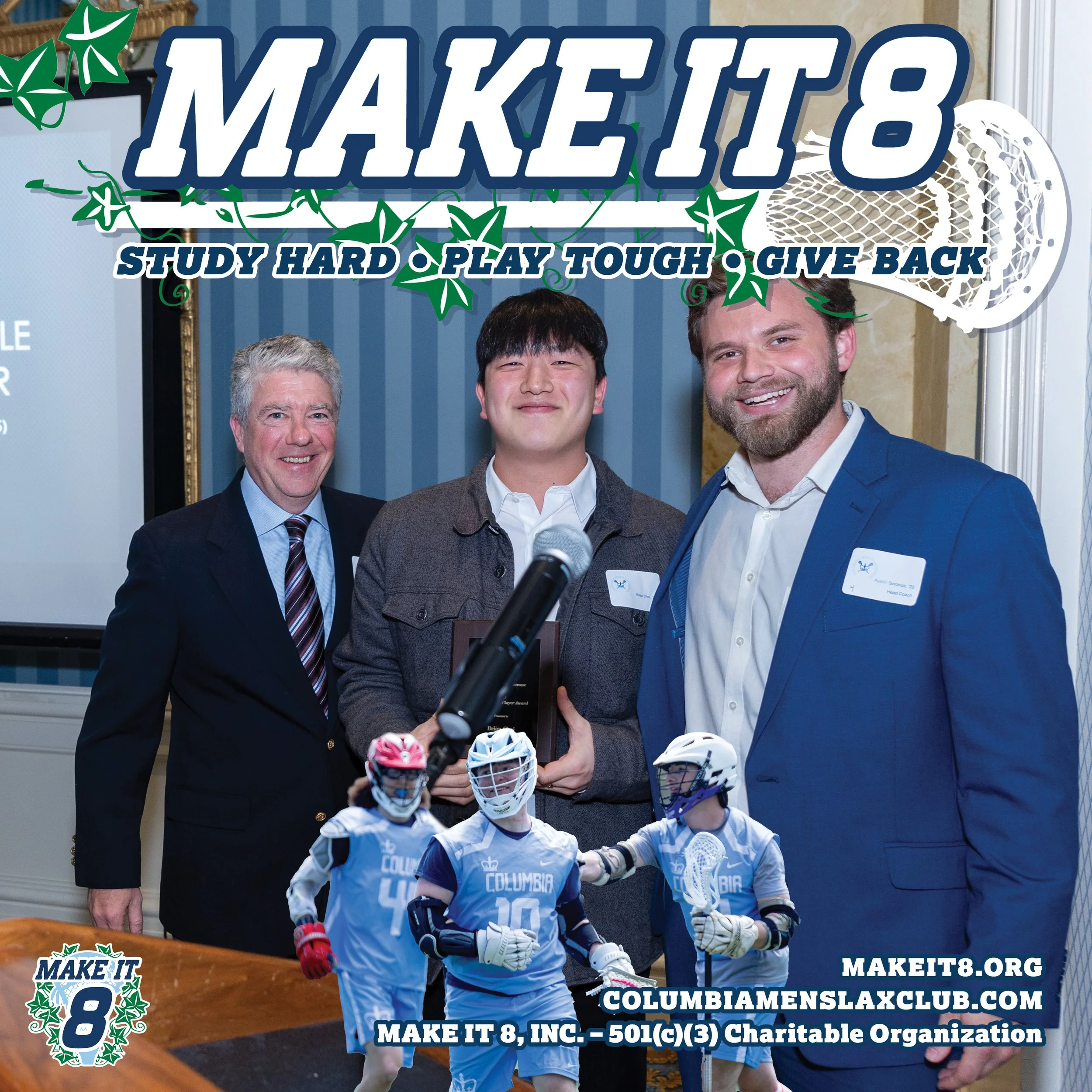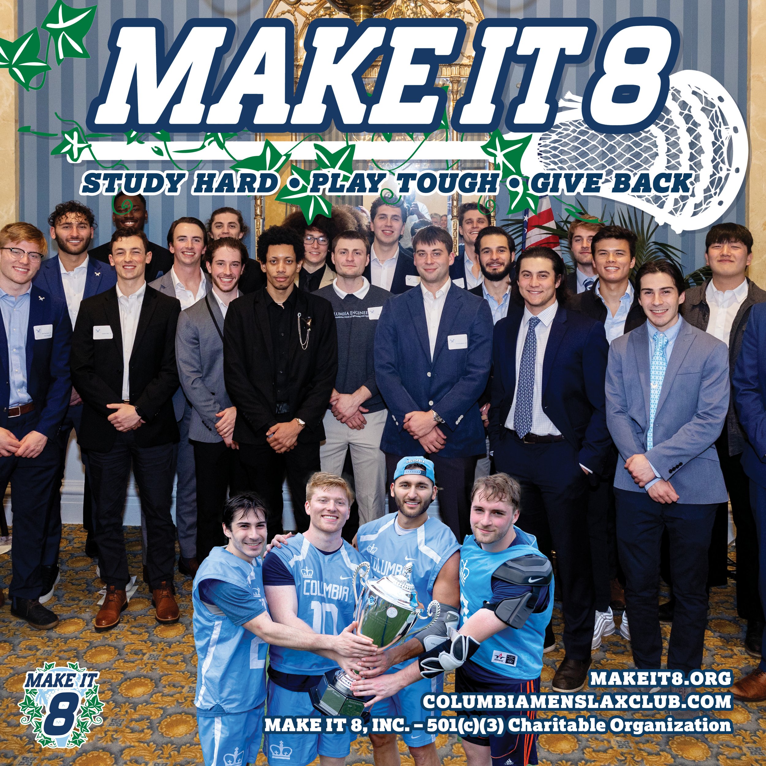Founded in 2018, Make It 8 is an assembled group of Columbia Men’s Lacrosse Club alumni who want to cultivate interest and support for the Columbia Men’s Lacrosse Club, and to develop it into an Ivy League varsity team.