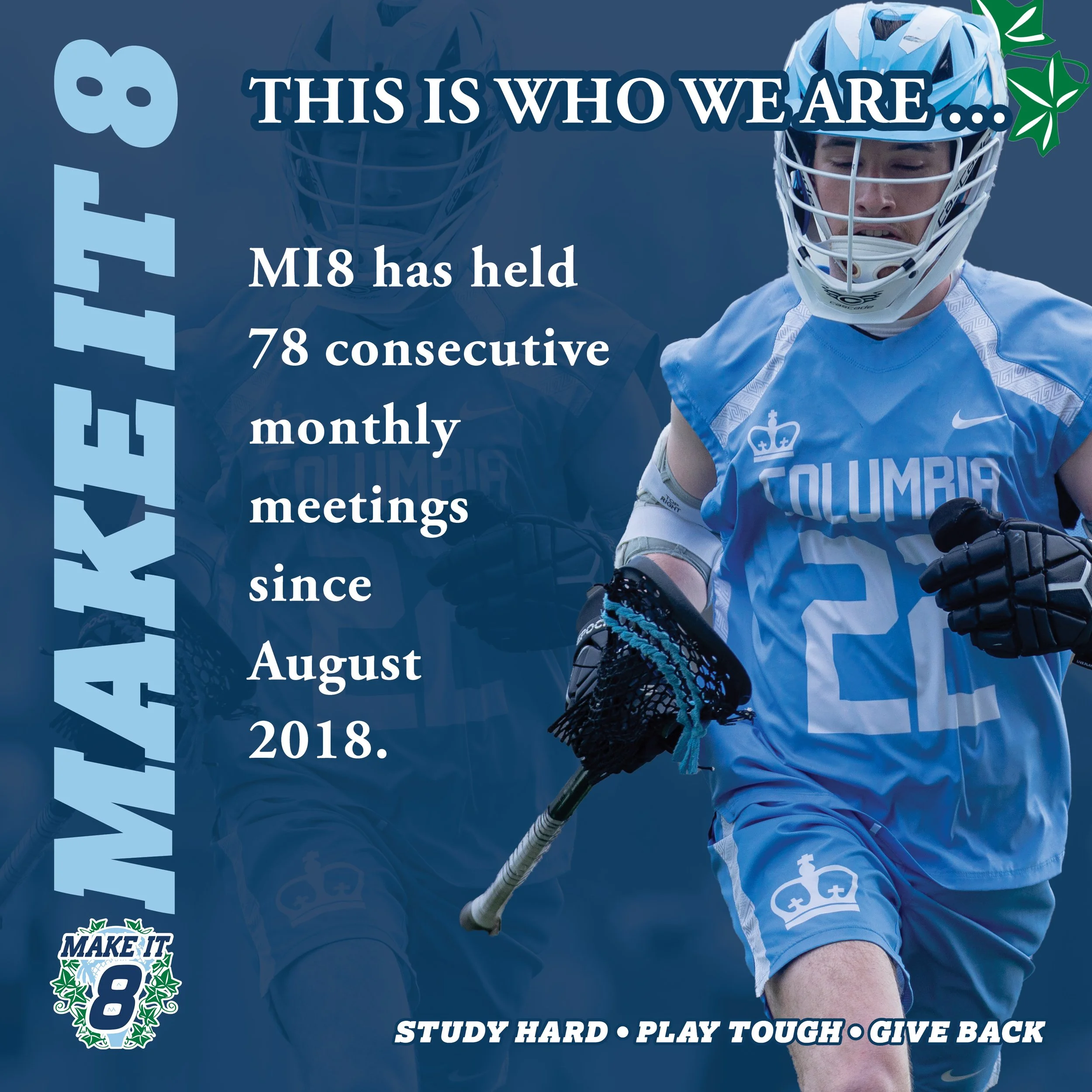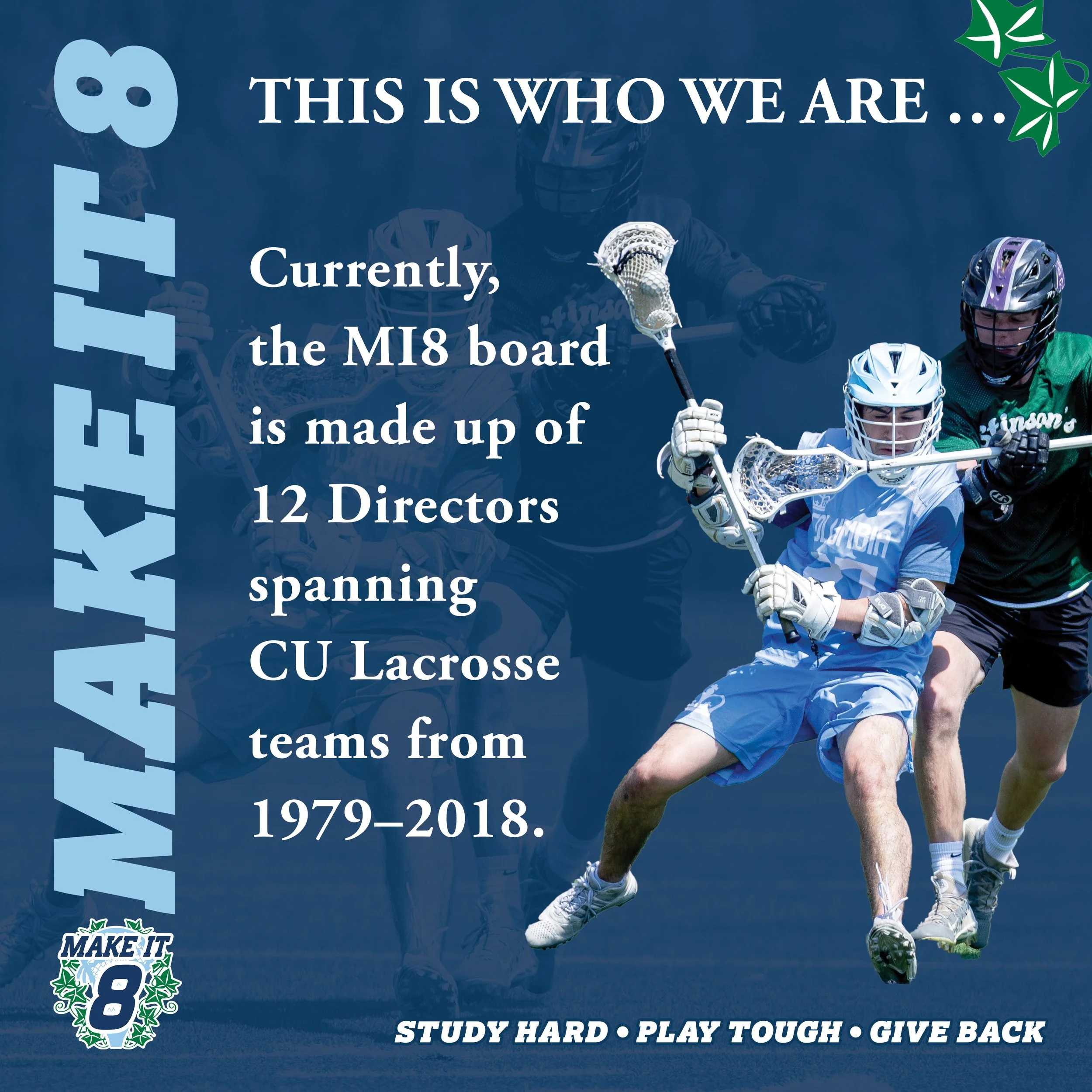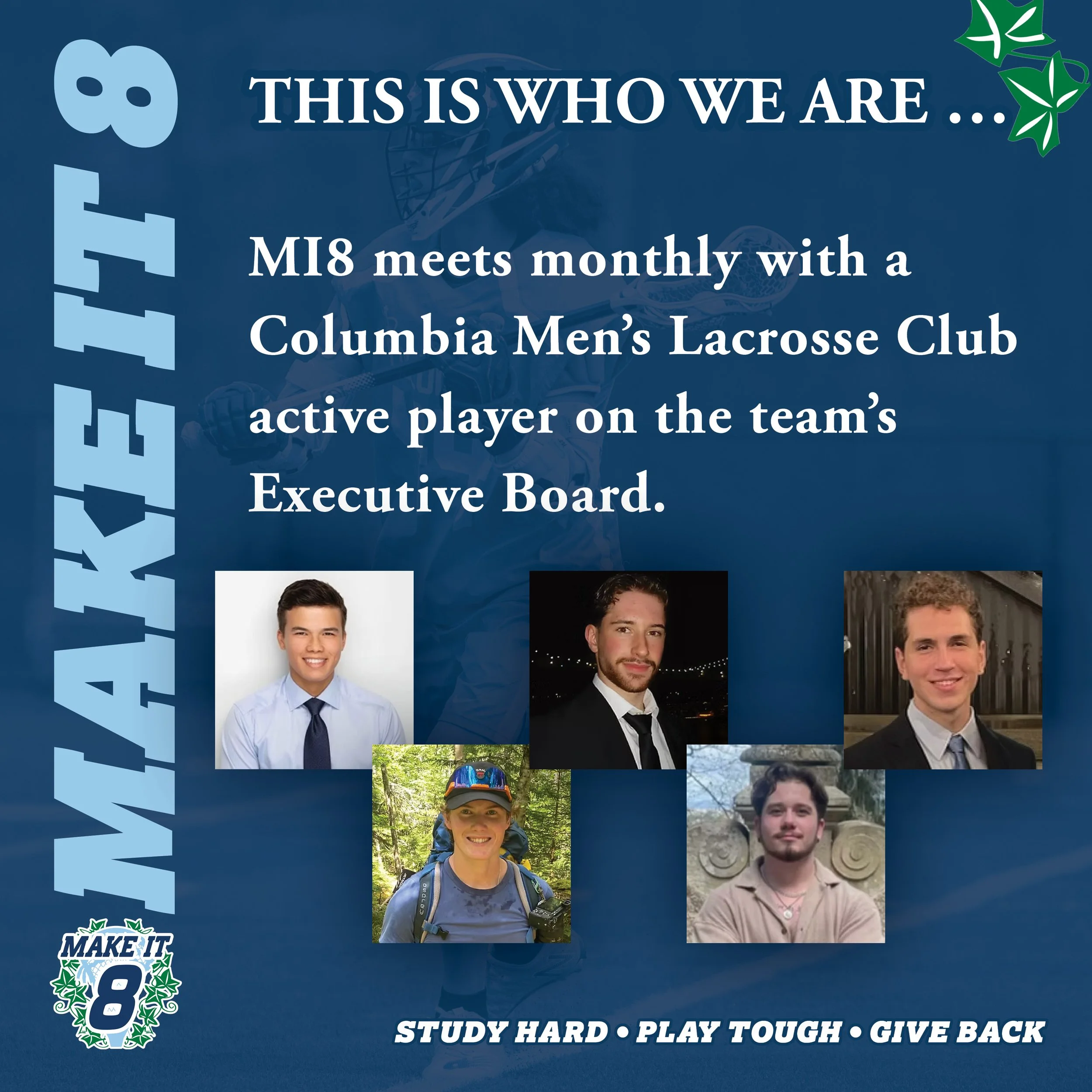 Founded in 2018, Make It 8 is an assembled group of Columbia Men’s Lacrosse Club alumni who want to cultivate interest and support for the Columbia Men’s Lacrosse Club, and to develop it into an Ivy League varsity team.
