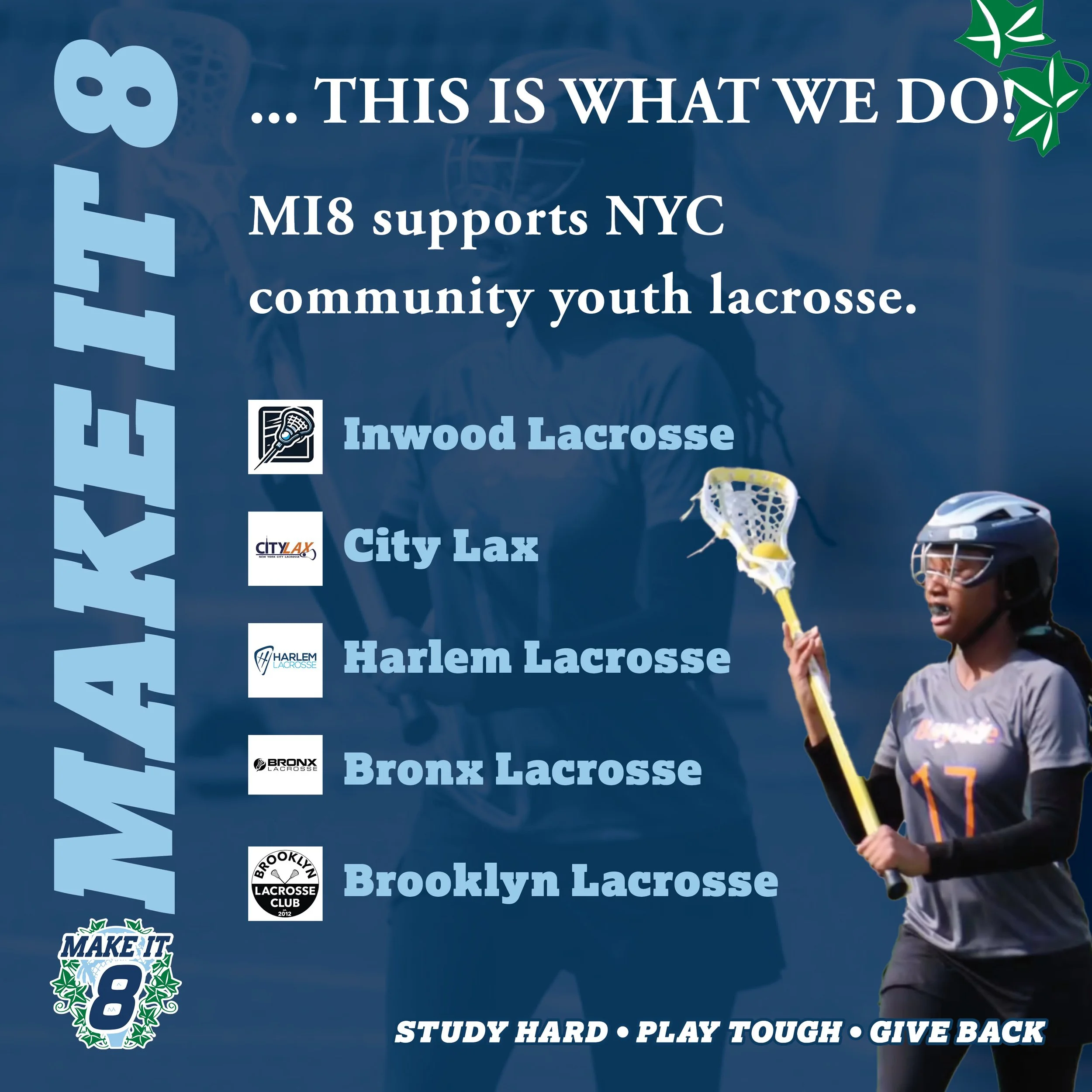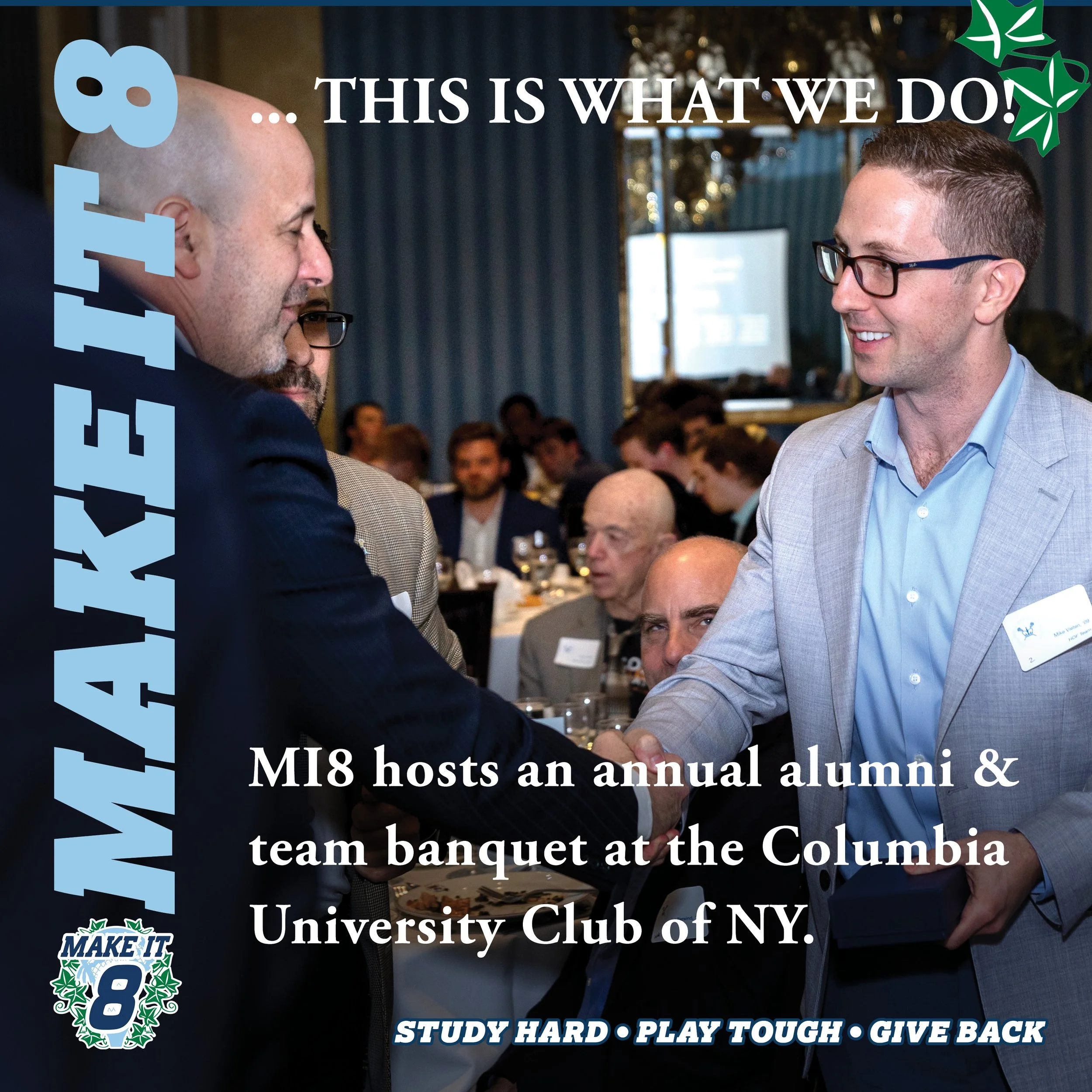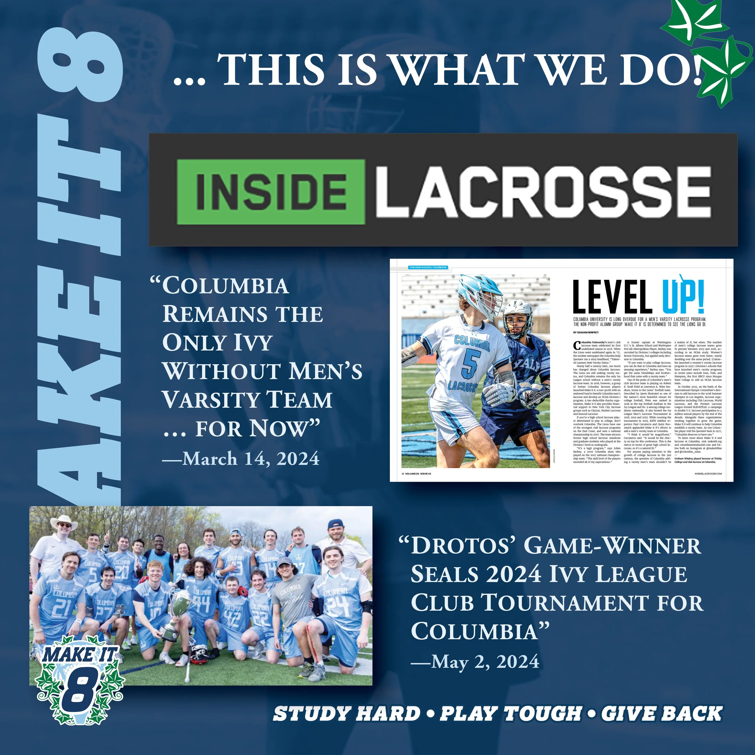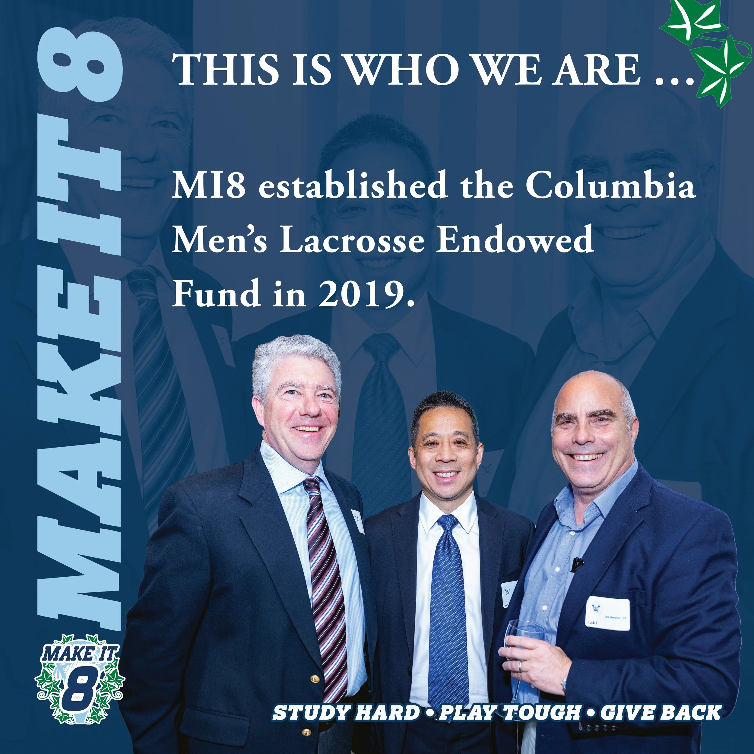 Founded in 2018, Make It 8 is an assembled group of Columbia Men’s Lacrosse Club alumni who want to cultivate interest and support for the Columbia Men’s Lacrosse Club, and to develop it into an Ivy League varsity team.